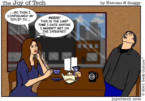 HomeGeek Culture... Geek Love, Geek Files, Mind Numbing Magazine, all kinds of geeky stuff!The Webstore! Get some cool stuff, and support your fave comic creators!e-Cards!The ForumsThe Joy of Tech! ...your quick fix of comic fun!After Y2K ... the webcomic epic!webcam!
