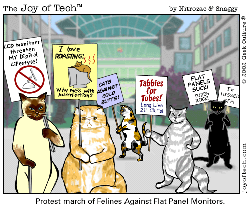 • Cats, unable to soak in heat from CRT monitors, will soak in heat from other sources, thereby causing an ice age.